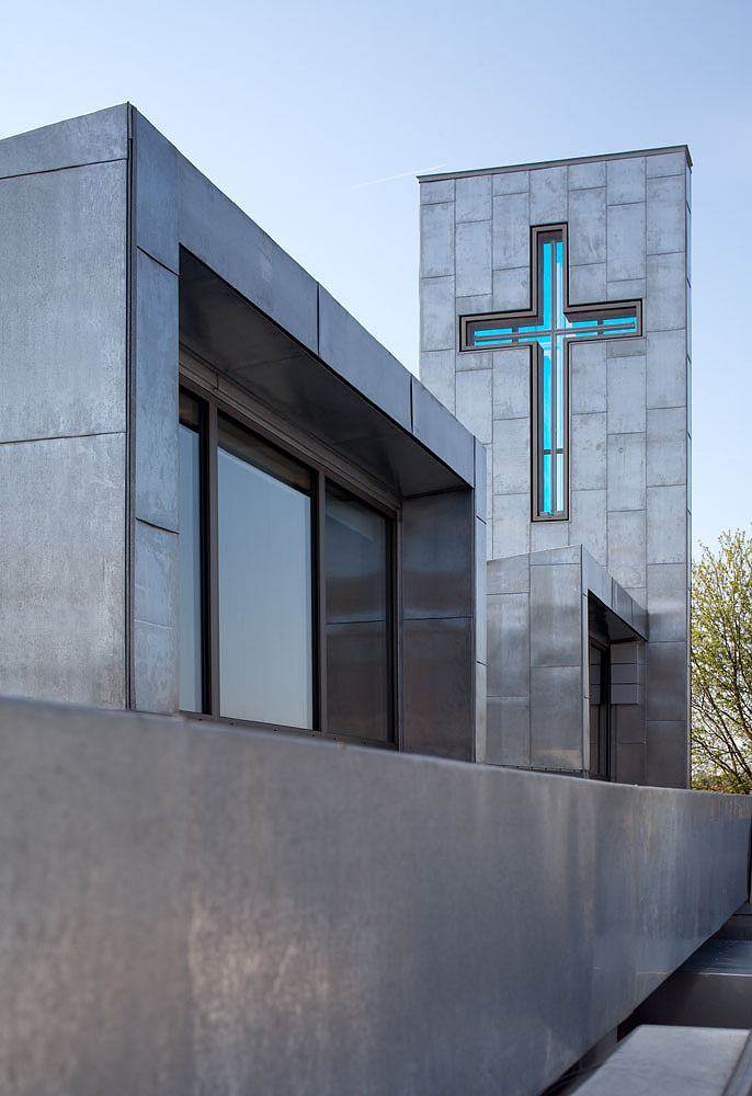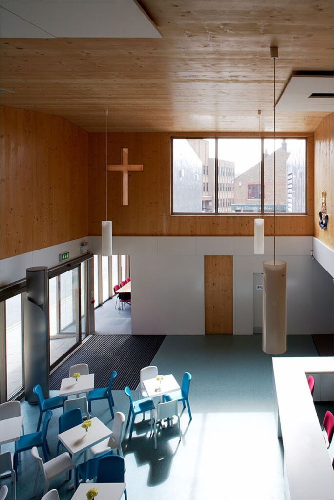 Constructed entirely of timber & cloaked in an undulating zinc roof, the £2 million Salvation Army Citadel Corps in Chelmsford provides 900 sq m new accommodation for the mission. The project illustrates our commitment to pioneering modern methods of construction to maximise the potential of sustainable materials. The building is constructed using a cross-laminated timber panel system, akin to jumbo plywood and offers all the advantages of reinforced concrete construction without the environmental cost. A rich variety of façade treatments, including a spectacular tower offers much to passers-by, lifts an otherwise drab neighbourhood.