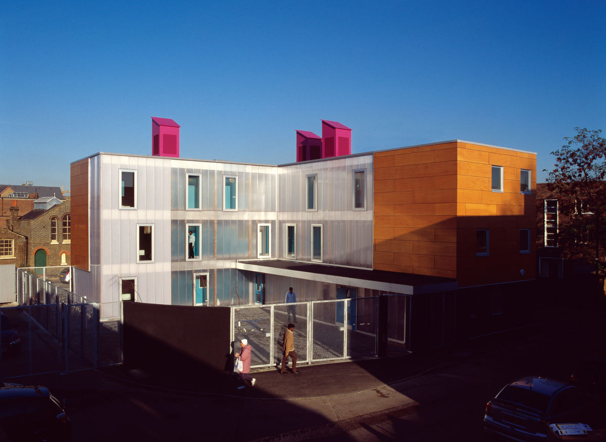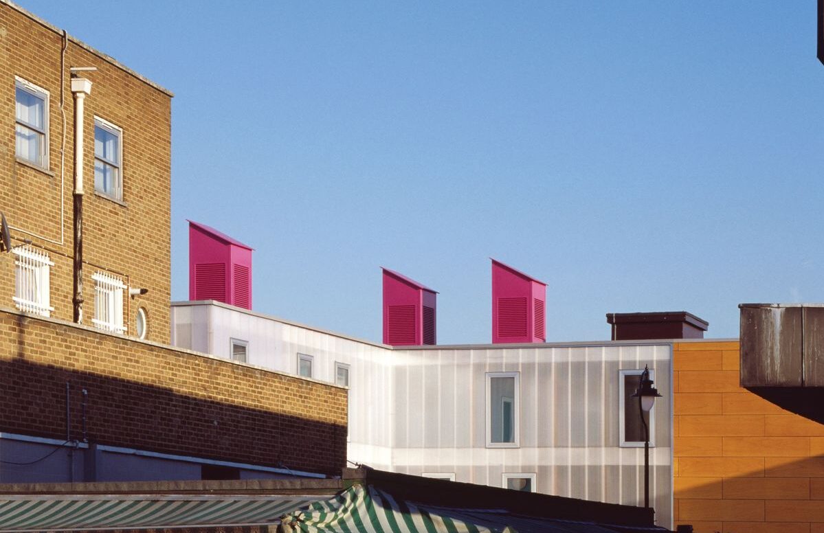 Built on the site of a disused housing depot, the 750 square metre development provides commercial units for small and medium businesses to sublet, providing a much-needed boost to the local economy in Haringey. The design, which won the support of local residents and businesses through a public consultation process, combines modern durable materials and a bright palette within a low energy cost-efficient building and is characterized by bright pink ventilation chimneys.